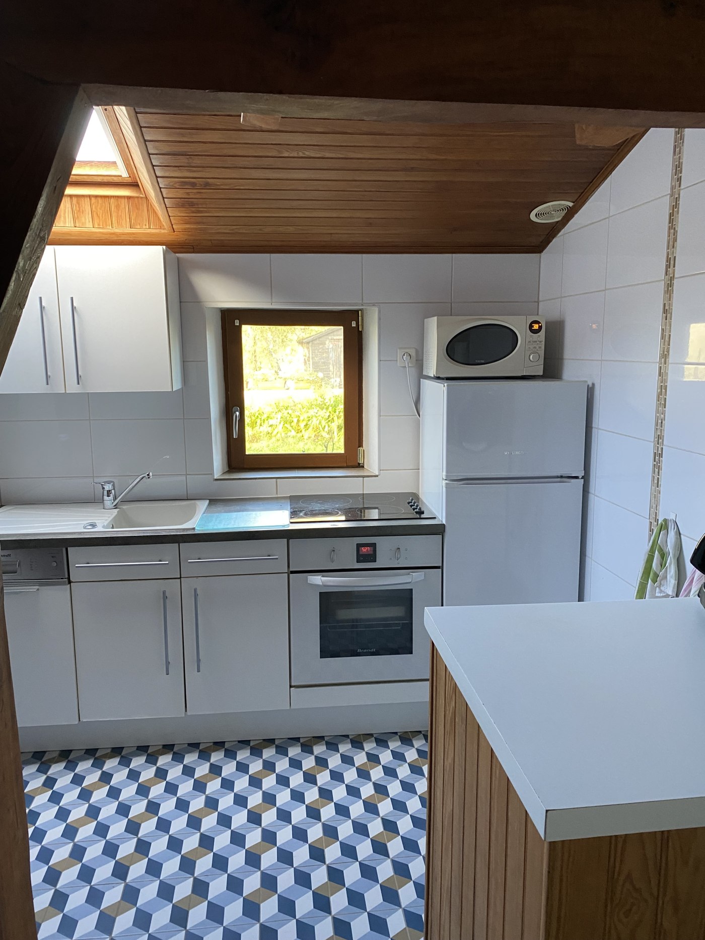 RDC : salon , séjour avec coin cuisine rénovée et bien équipée ( lave- vaisselle, réfrigérateur-congélateur, four classique, micro onde); salle de douche avec wc.