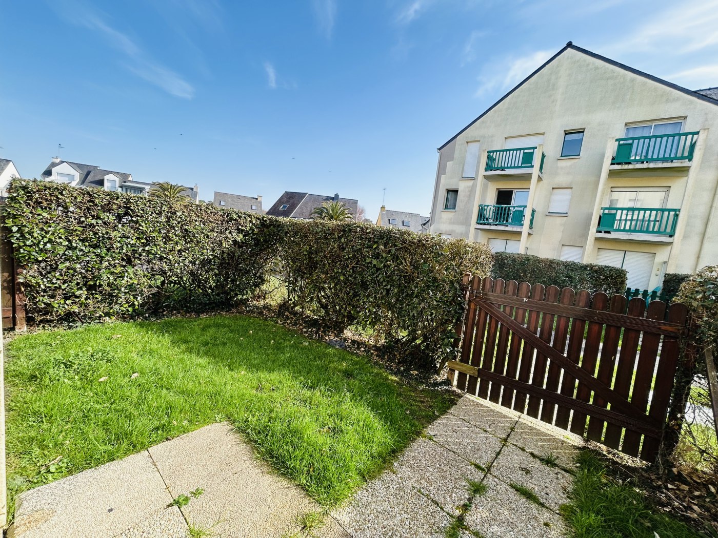 Petite terrasse abritée et jardinet clos. Petite vue mer de la terrasse.