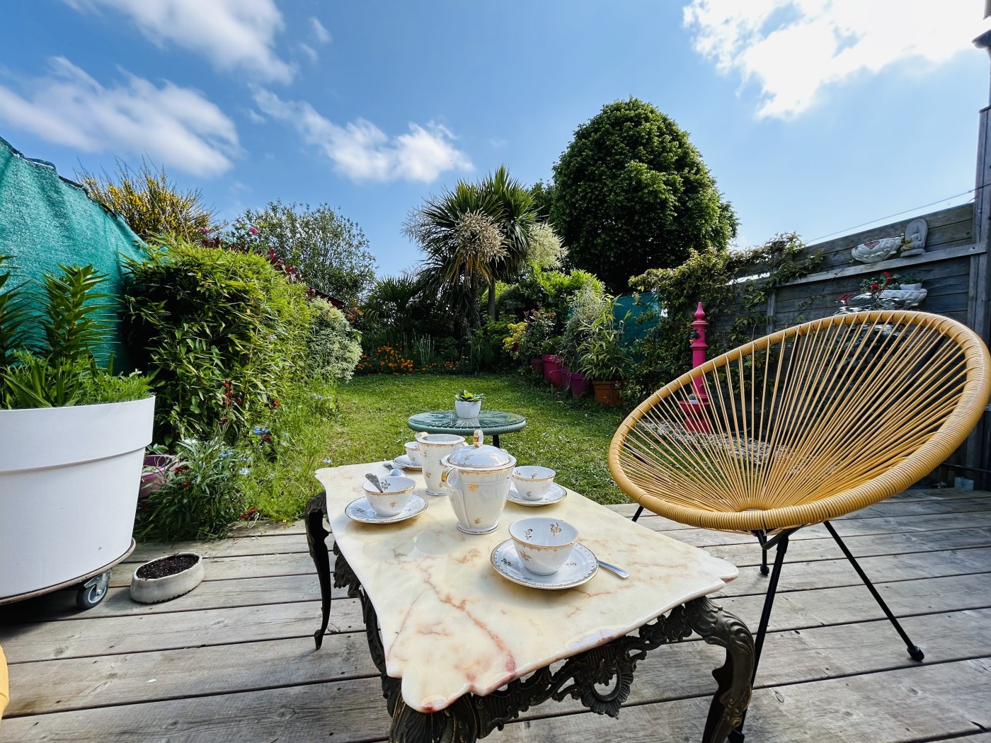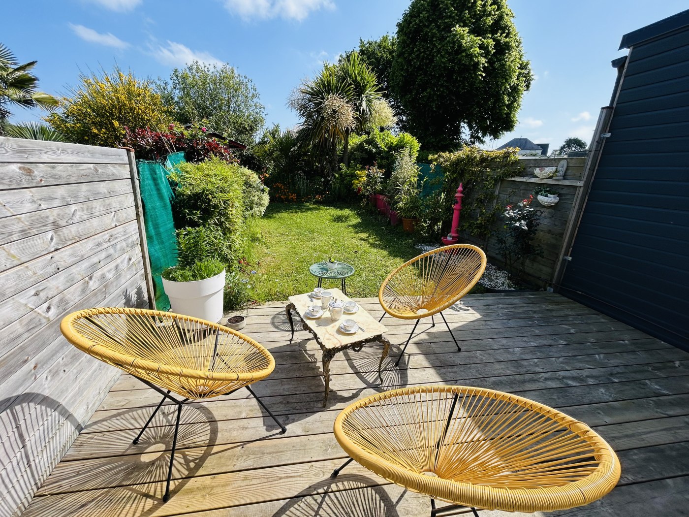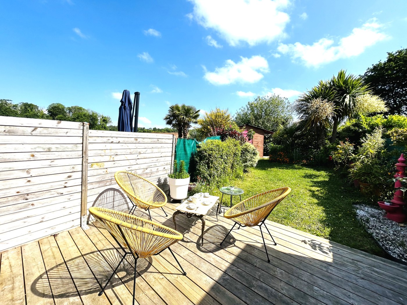 - Séjour avec baie vitrée donnant sur une terrasse bois de 20 m2, équipée de salon de jardin