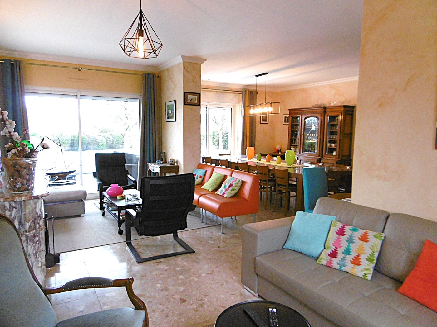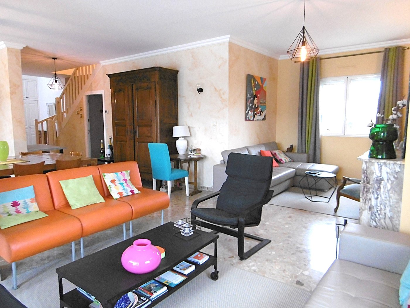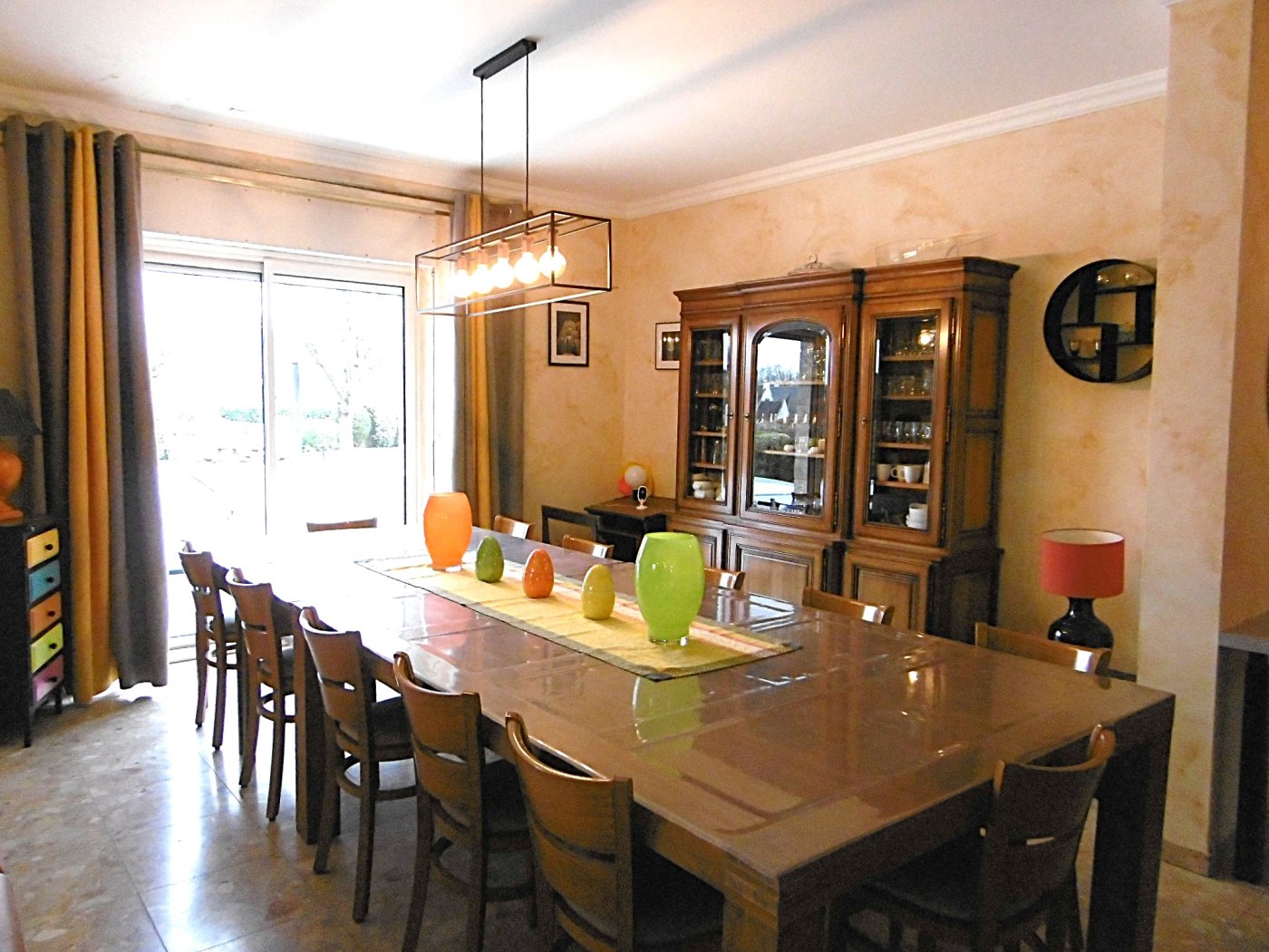 - Un spacieux séjour / salle à manger offrant une vue sur le jardin avec un accès sur la terrasse et la piscine