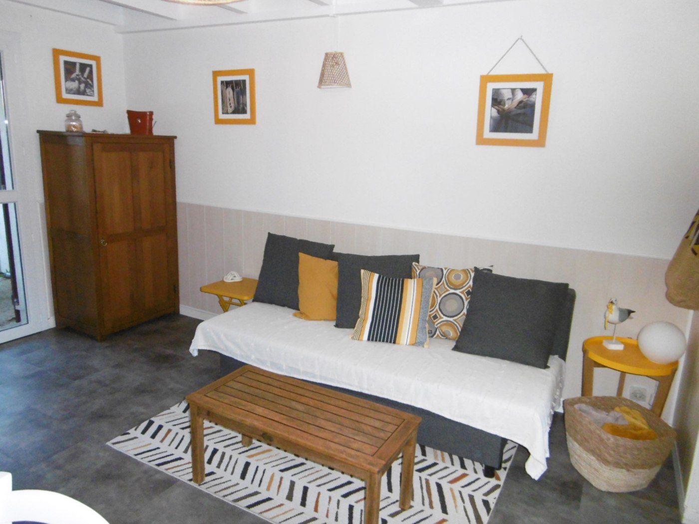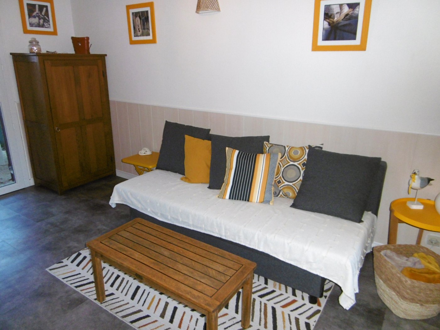 - Un séjour avec un canapé type clic-clac donnant sur le jardin