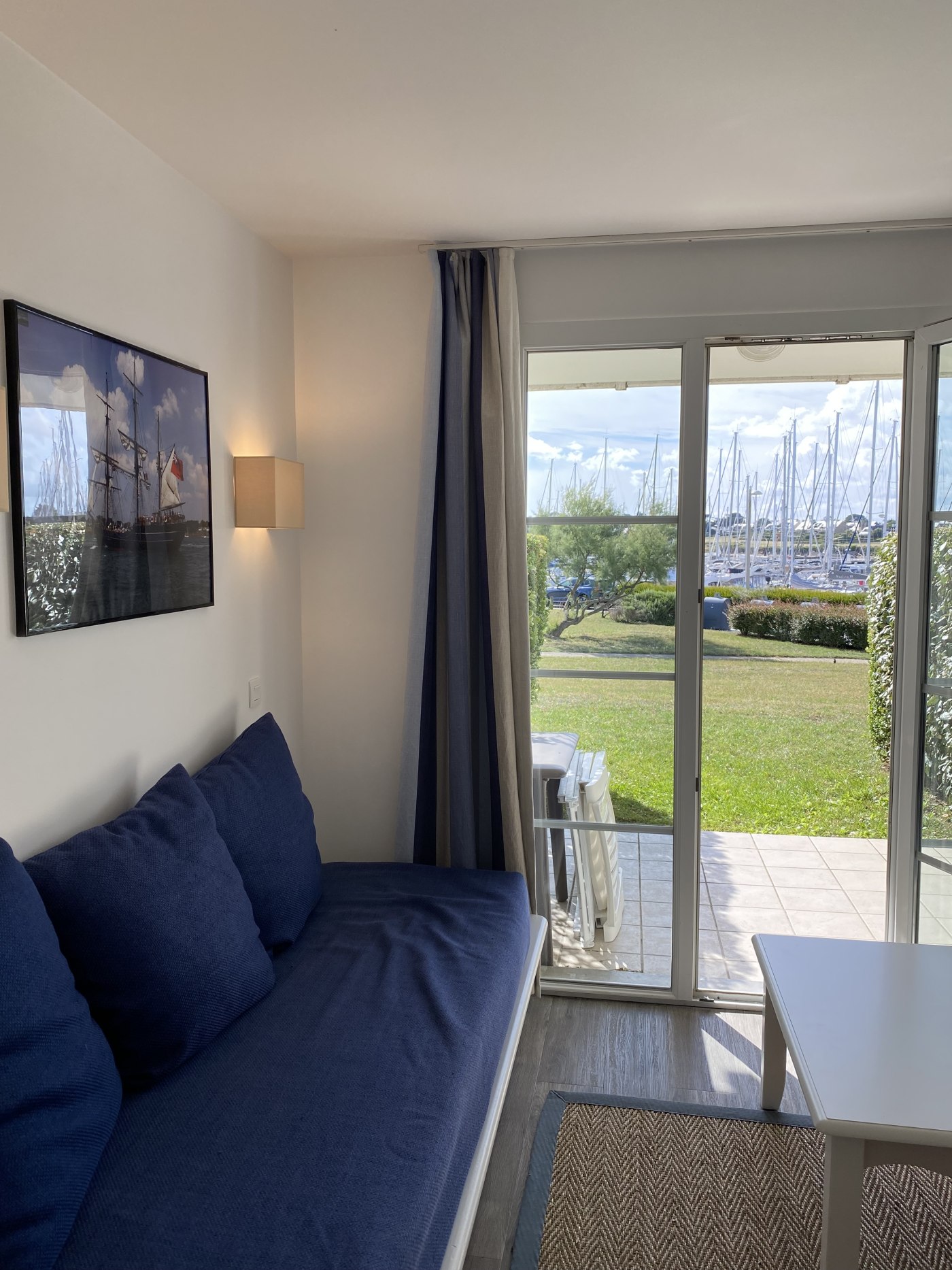 La baie vitrée ouvre devant les bateaux et permet aux enfants de jouer sur le gazon.
